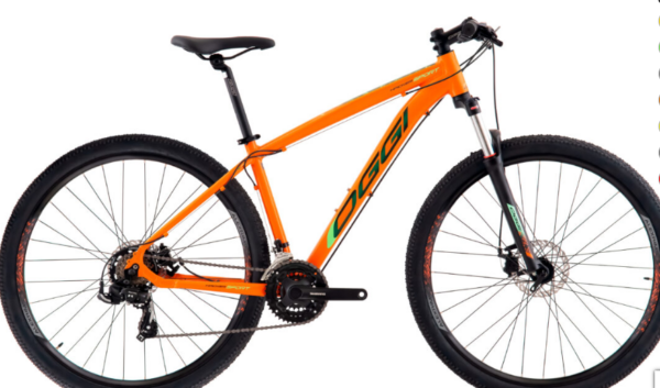 Quadro de aluminio 6061 T6, tam. 17 e 19, aro 29, 21 veloc, amortecor, freio a disco mecânico, Shimano (alavancas, cambios, pedivela), aluminio (cubos, canote e guidon), seguro grátis por 14 meses contra roubo qualificado.